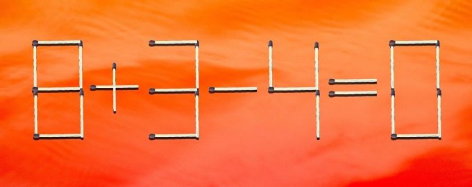 Μπροστά σας υπάρχει ένα παράδειγμα 8+3-4=0=0, το οποίο είναι προφανώς λανθασμένο. Μπορείτε να μετακινήσετε μόνο ένα σπίρτο για να κάνετε το πρόβλημα να βγάλει νόημα. Σύμφωνα με τους κανόνες τέτοιων γρίφων δεν μπορείτε να αφαιρέσετε ραβδιά από το σύμβολο “=” ή να το διαγράψετε, αλλά μπορείτε να αλλάξετε οποιαδήποτε άλλα σύμβολα και αριθμούς.