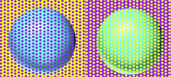 Η δεξιά μπάλα εμφανίζεται κίτρινη ή πρασινοχρυσή, επειδή το φόντο γύρω της είναι μωβ με κίτρινες κουκκίδες, γεγονός που κάνει τη μπάλα οπτικά πιο “ζεστή”.