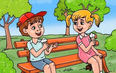 Στην εικόνα βλέπουμε ένα αγόρι και ένα κορίτσι να κάθονται σε ένα παγκάκι του πάρκου και να τρώνε παγωτό. Στο βάθος βλέπουμε δέντρα με μεγάλες πράσινες κορώνες. Οι καιρικές συνθήκες που απεικονίζονται στην εικόνα υποδηλώνουν ότι η δράση λαμβάνει χώρα το καλοκαίρι.